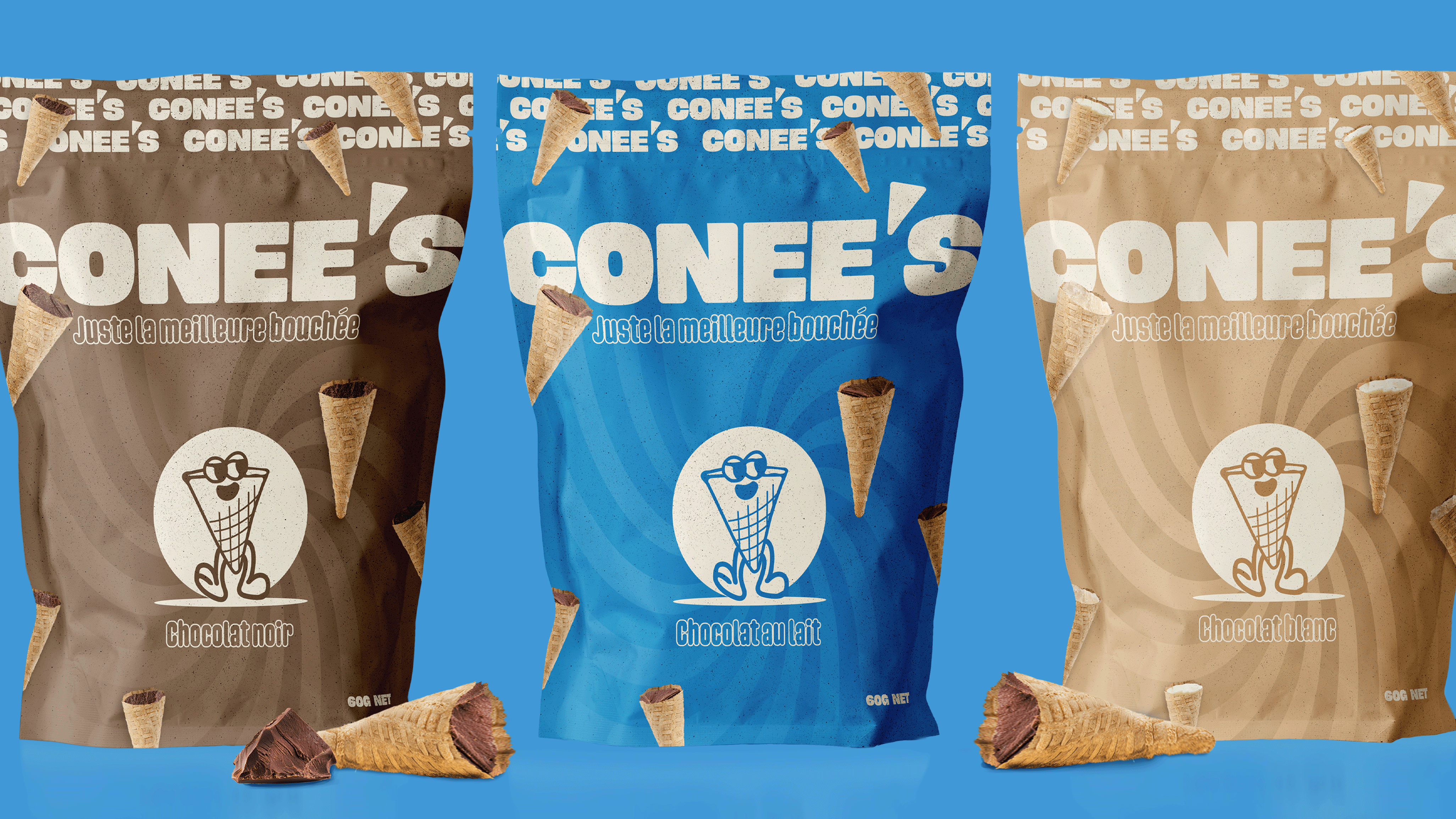 Conee’s est une marque innovante qui vend la fin des cornets de glace, le bout en chocolat. Le client souhaitait une identité de marque et un packaging qui : Capte l’attention dans les rayons, transmet le plaisir gourmand et la petite touche ludique du produit, est facilement identifiable et mémorable pour un public large.